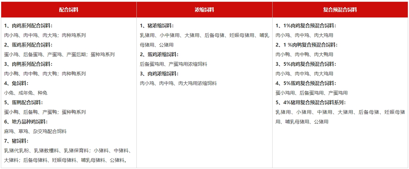 主營(yíng)業(yè)務(wù)為研發(fā)、生產(chǎn)、銷售各類全價(jià)配合飼料、預(yù)混合飼料、濃縮飼料,主要產(chǎn)品包括:鴨、雞、豬、水產(chǎn)等幾大類。各類飼料又根據(jù)動(dòng)物品種、生長(zhǎng)階段、產(chǎn)品性態(tài)等的不同設(shè)計(jì)不同的配方,生產(chǎn)符合不同區(qū)域、不同生長(zhǎng)階段的各種專用飼料。